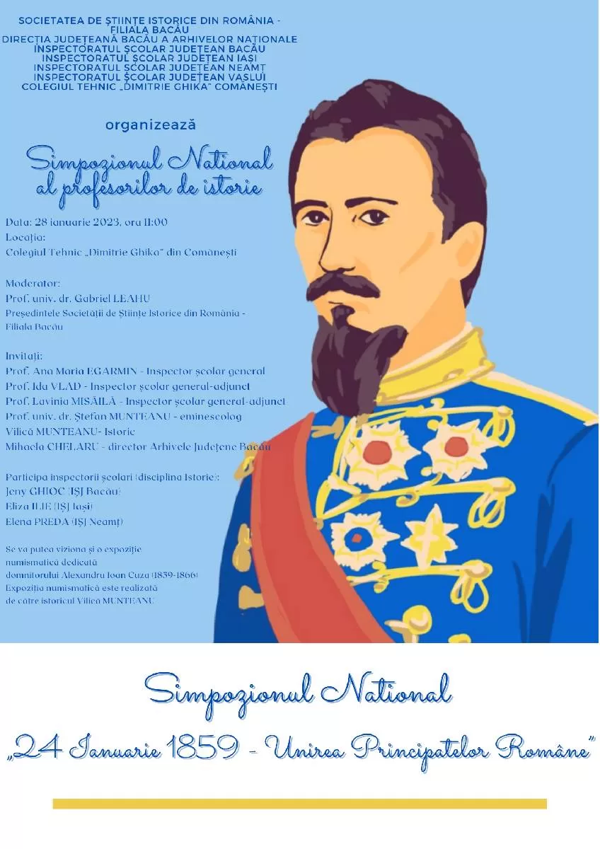 Societatea de Științe Istorice din România–Filiala Bacău în parteneriat cu Direcția Județeană Bacău a Arhivelor Naționale, Inspectoratul Școlar Județean Bacău, Inspectoratul Școlar Județean Iași, Inspectoratul Școlar Județean Neamț, Inspectoratul Școlar Județean Vaslui și Colegiul Tehnic „Dimitrie Ghika” din Comănești organizează în data de 28 februarie 2023 Simpozionul Național al Profesorilor de Istorie dedicat sărbătoririi Unirii Principatelor Române.