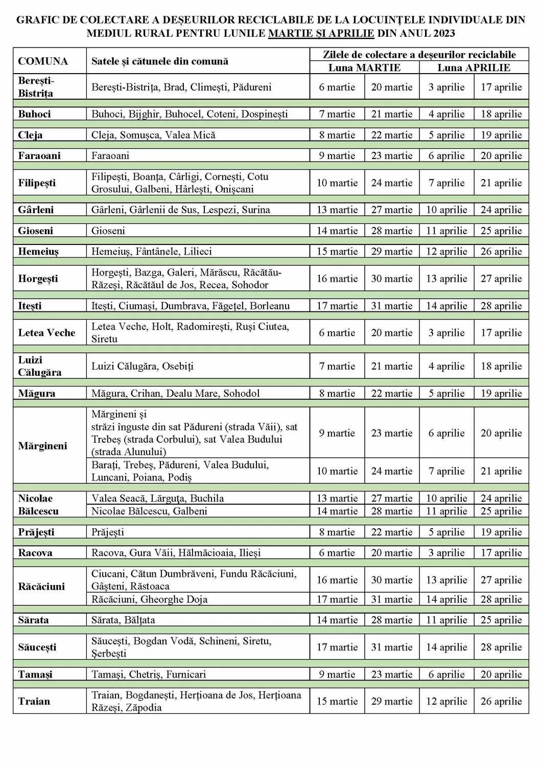 Astfel, se va proceda la efectuarea celor două colectări a deșeurilor reciclabile în satele și cătunele din fiecare comună în parte. Precizăm că graficul de ridicare a deșeurilor reziduale în aceste două luni rămâne neschimbat, respectiv deșeul rezidual va fi ridicat cu frecvență săptămânală, în zilele cunoscute.