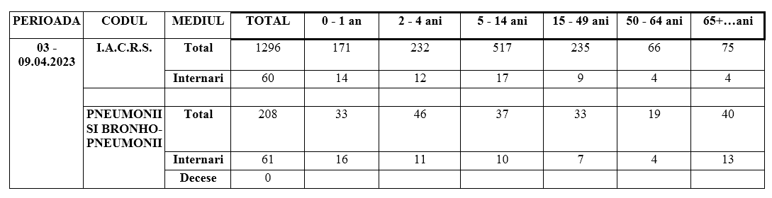 În ceea ce privește cazurile grave care necesită internare, s-au raportat 121 de cazuri (60 pentru I.A.C.R.S. și 61 pentru pneumonii și bronhopneumonii). Din fericire, nu s-au înregistrat decese cauzate de aceste afecțiuni respiratorii în această perioadă.