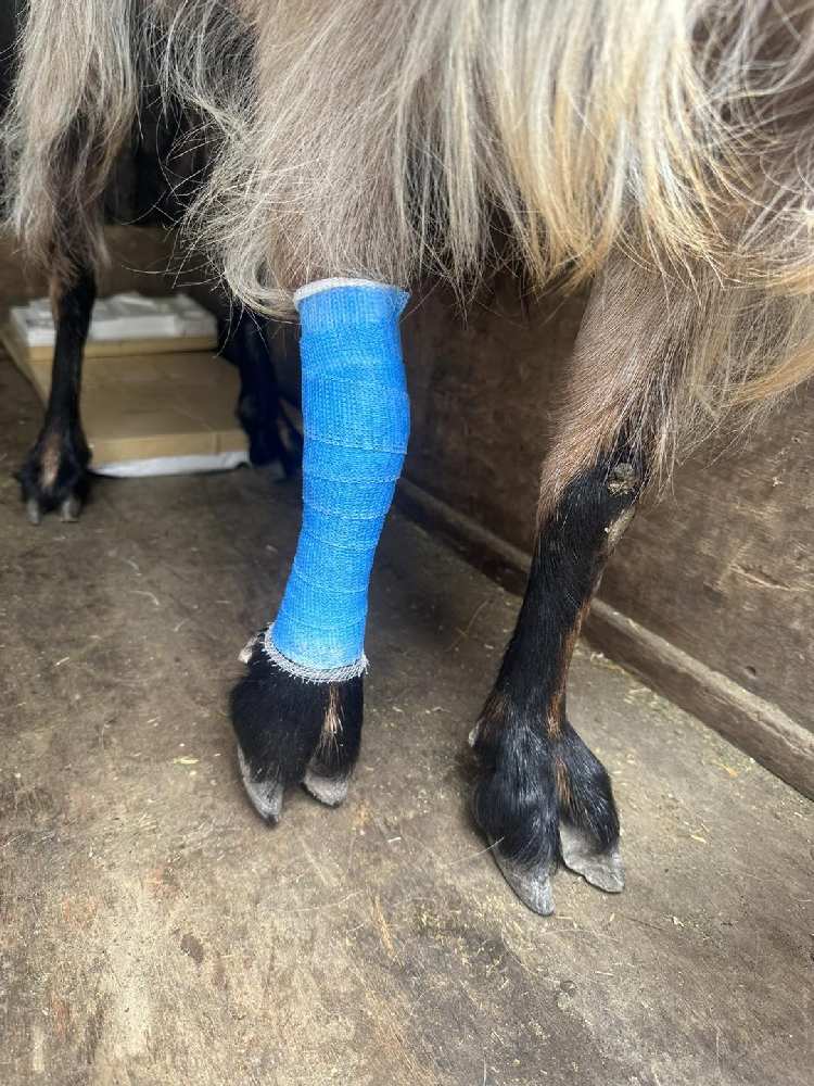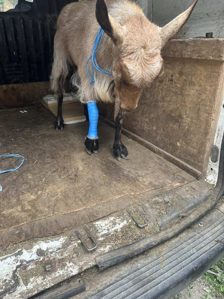 Recent, familia a trebuit să găsească o soluție creativă pentru a rezolva problema creată de căpriță, așa ca animalul a primit o porție bună de ghips, aplicată pe piciorul din față.