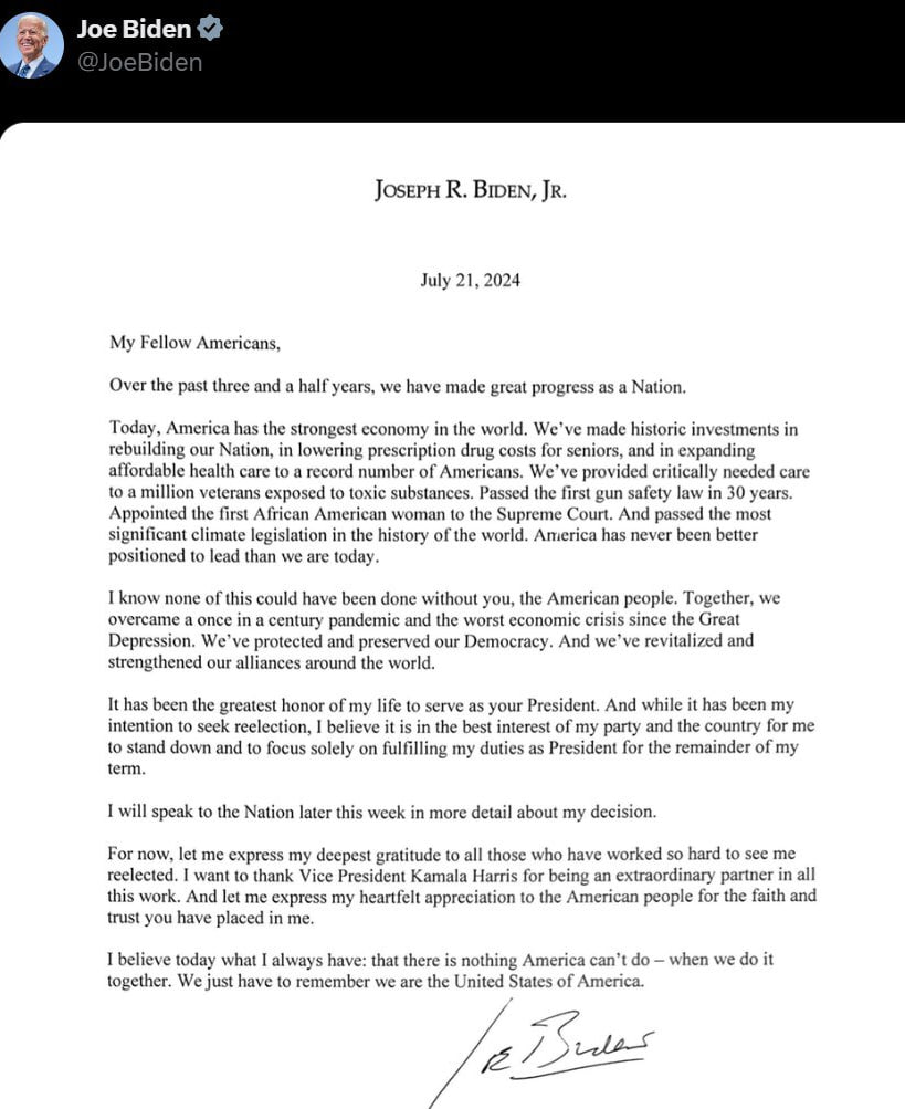 A fost cea mai mare onoare a vieții mele să servesc ca președinte al vostru. Deși intenția mea a fost să candidez pentru realegere, cred că este în cel mai bun interes al partidului și al țării să mă retrag și să mă concentrez exclusiv pe îndeplinirea îndatoririlor mele ca președinte pentru restul mandatului meu. Voi vorbi națiunii mai târziu în această săptămână, oferind mai multe detalii despre decizia mea.