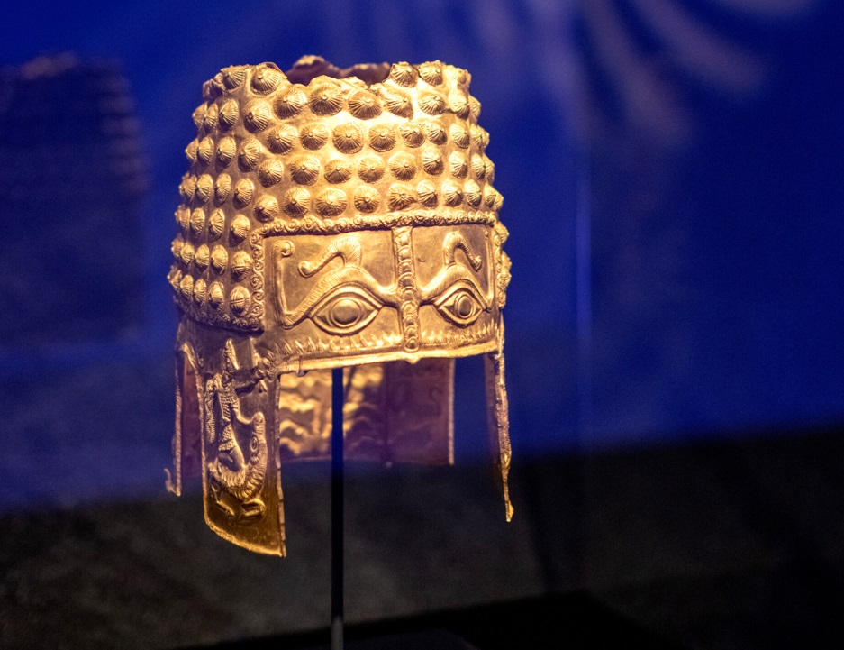 Un alt detaliu important este puritatea aurului folosit pentru coif: 75‰, echivalentul a 18 carate. Aceasta indică un aliaj de aur de calitate medie, dar perfect potrivit pentru un obiect ceremonial, cu rezistență mai mare decât aurul pur.