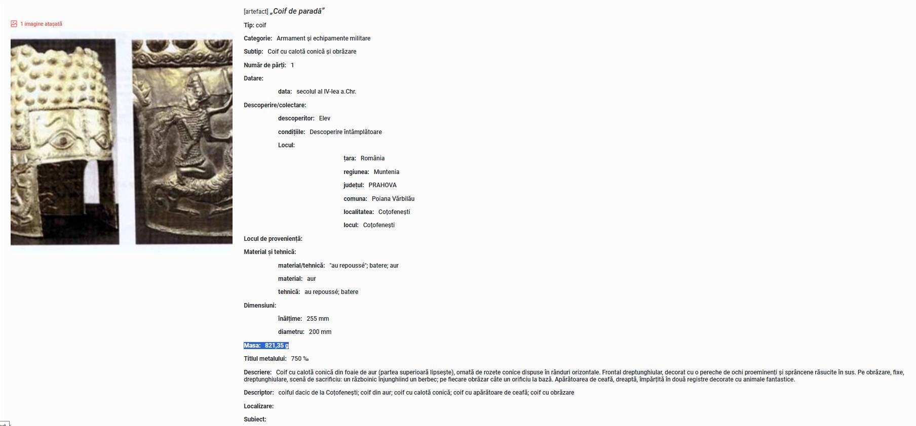 Cel mai șocant este însă documentul oficial al Institutului Național al Patrimoniului, care, la 19 iunie 2023, îl descria ca având 821,35 grame. Aceasta reprezintă cea mai mare greutate atribuită vreodată coifului.