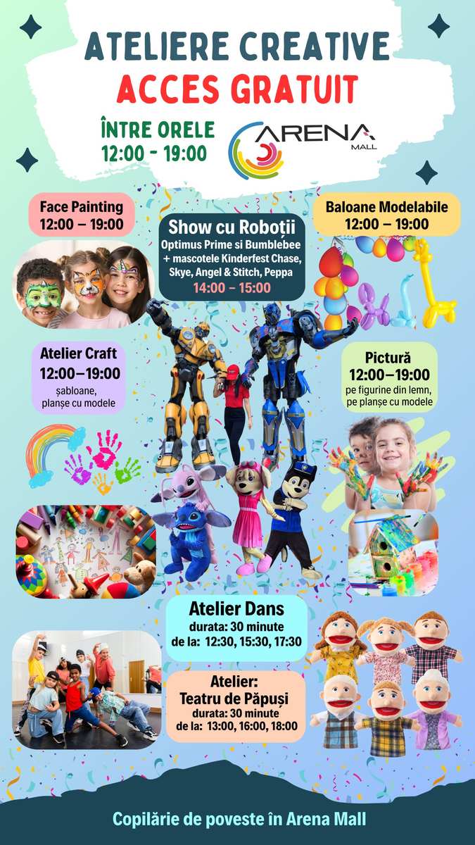 Pe parcursul zilei, cei mici vor putea participa gratuit la ateliere creative interactive, momente artistice și surprize de poveste, într-un program special conceput pentru a aduce zâmbete și amintiri frumoase.