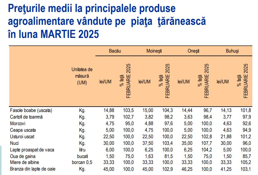 Pentru consumatorii care caută cele mai bune prețuri, piețele din Buhuși și Onești oferă avantaj competitiv, însă pentru calitate și diversitate, Moinești rămâne liderul județului în luna martie 2025.