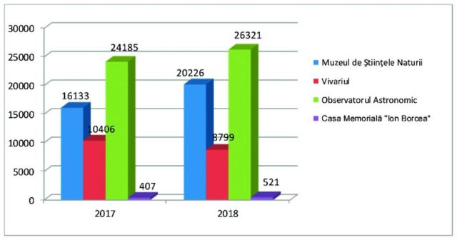 Numărul de vizitatori ai Complexului Muzeal de Ştiinţele Naturii „Ion Borcea”, pe subunităţi, pentru anul 2018, comparativ cu anul 2017 este evidenţiat de graficul de mai jos.