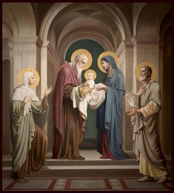 În Templul din Ierusalim, la patruzeci de zile după naștere, Mântuitorul este adus pentru a fi împlinită Legea neamului lui Avraam, care prevedea că orice întâi născut de parte bărbătească să fie afierosit lui Dumnezeu. Două persoane preiau funcția de primitori ai lui Hristos. Dreptul Simeon, omul cuvântului și al așteptării, cel care potrivit tradiției a făcut parte dintre traducătorii Pentateuhului în limba greacă, un muribund fericit, plin de Duh Sfânt, care pune în vers oftatul lumii în așteptarea Mântuitorului. Și Ana lui Fanuel, chipul duhovnicesc al cetății, văduva curată, care-și petrecea timpul în post și rugăciune. Pentru cei doi, care o crescuseră și pe Maica Domnului la Templu, vederea Domnului Hristos îi apropia de plinirea misiunii pentru care fuseseră îngăduiți îndelung în viață, umplerea Templului de slava Cerului.