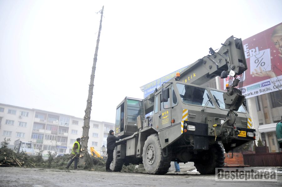 Angajatii Primariei Bacau au demontat joi bradul din Piata Tricolorului, care a ornat centrul la sarbatorile de iarna.