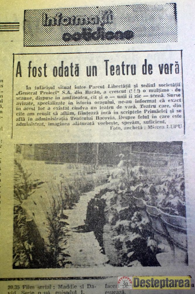 dispuse în amfiteatru, cât și o – unii îi zic – scenă” consemna în vara anului 1995, ziaristul Mircea Lupu. „Surse avizate, specializate în istoria orașului, ne-au informat că exact în acest loc a existat cândva un teatru de vară.