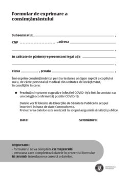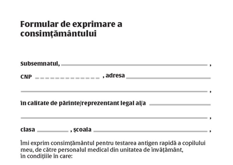 Ministerul Sănătății a publicat formularul prin care părinţii îşi exprimă consimțământul pentru testarea antigen a copiilor la școală. Acordul este valabil în situaţia apariţiei unui caz confirmat de infectare cu virusul SARS-CoV-2 într-o clasă. Ministerul le recomandă părinților să ducă la şcoală acordul completat şi semnat, încă din prima zi.