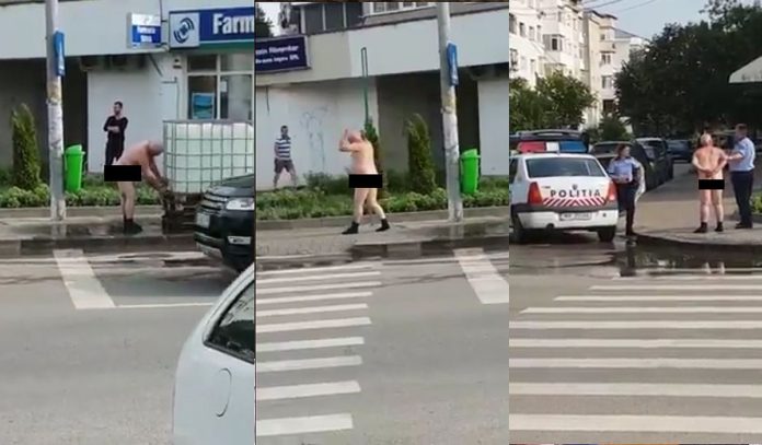 Exasperat de lipsa apei, după o avarie care durează de o săptămână, un băcăuan a ieșit, ieri, în pielea goală pe stradă ca să se îmbăieze cu apă de la unul dintre recipientele amplasate de Primărie și din care locuitorii orașului se aprovizionează cu apă menajera.