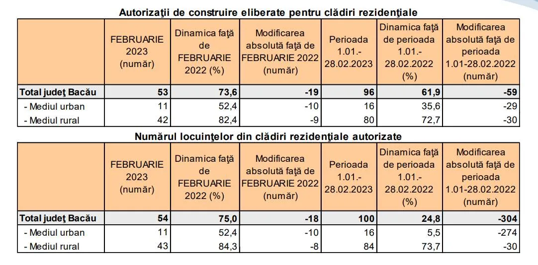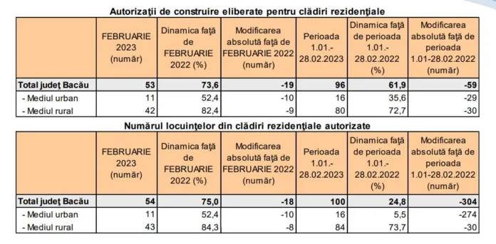 Potrivit datelor furnizate de Direcția Județeană de Statistică Bacău, numărul autorizațiilor de construire eliberate pentru clădirile rezidențiale în luna februarie 2023 a fost de 53, ceea ce reprezintă o scădere cu 26,4% față de aceeași perioadă a anului trecut.