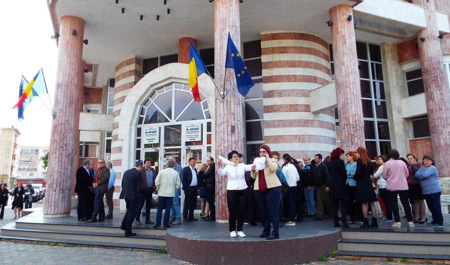 Și coeficienții de salarizare de la noi, de 1,96, până la ceva peste 2% la conducerea instituției, sunt foarte mici, ca și cum noi am fi corigenții clasei. Și noi, însă, cei din teritoriu suntem salariați model, care ar trebui să fim plătiți ca un corp de elită pentru ceea ce aducem bugetului de stat”. Miercuri, protestatarii au afișat pe ușa instituției trei exemple concrete în acest sens.
