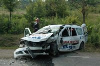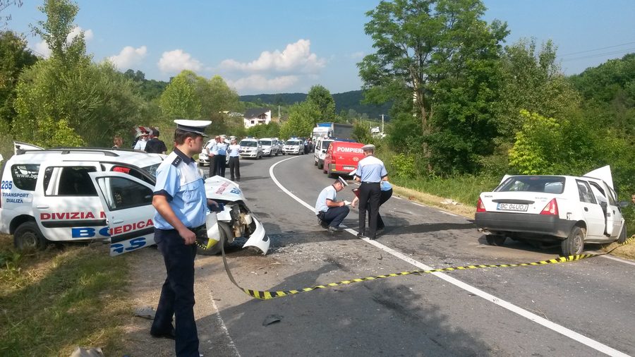 „In total au fost noua victime – sapte din ambulanta de transport dializati si doua din Dacia Solenza. Patru dintre ele erau in stare foarte grava, iar o pacienta, cu traumatism cranian deschis, a fost gasita decedata. S-au efectuat manevrele de prim ajutor, dupa care sase pacienti au fost transportati spre spitalul din Bacau, iar ceilalti doi, la cel din Moinesti. S-a solicitat si interventia unui elicopter, din cauza numarului mare de victime, parte dintre ele dializate.”