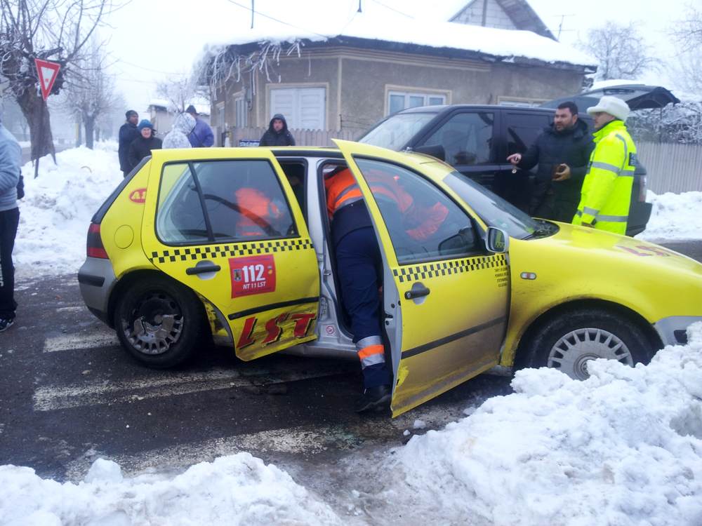 In urma accidentului, soferul taxiului a ramas incarcerat in masina.