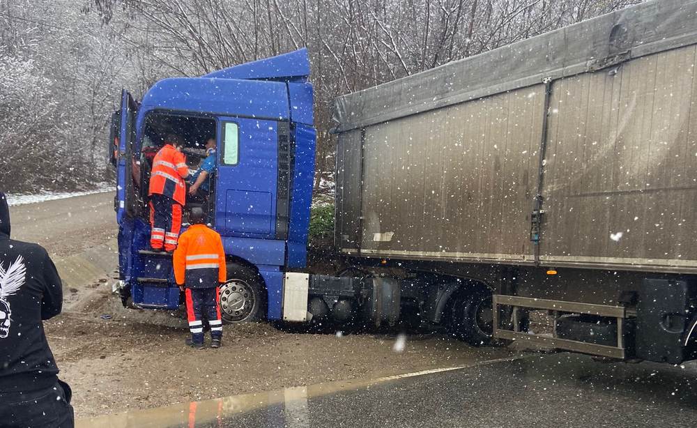 Accident rutier pe DN 11, Bârsănești, județul Bacău. Un autotren a derapat în șanțul de scurgere de pe sensul Bacău – Onești, blocând ambele sensuri de mers.