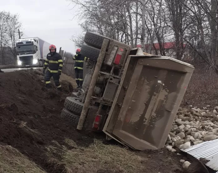La sosirea forțelor de intervenție, s-a constata faptul că o basculantă s-a răsturnat în afara părții carosabile.