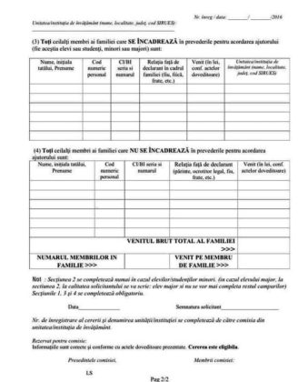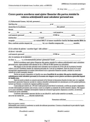 Pentru obţinerea ajutorului aferent achiziţionării unui calculator, părinții elevului minor, respectiv elevul major/studentul întocmesc o cerere conform modelului prevăzut în anexa nr. 2 din Hotărârea de Guvern nr. 1294/2004, pe care o depun launitatea/instituţia de învăţământ la care este înscris elevul/studentul.Cererile se transmit până la data de 17 aprilie 2020 prin poștă, email sau orice formă de mesagerie (gen whatsapp/messenger) către secretariatul școlii unde sunt înregistrate. Modalitatea de transmitere este comunicată de către conducătorul unității/instituției de învățământ.