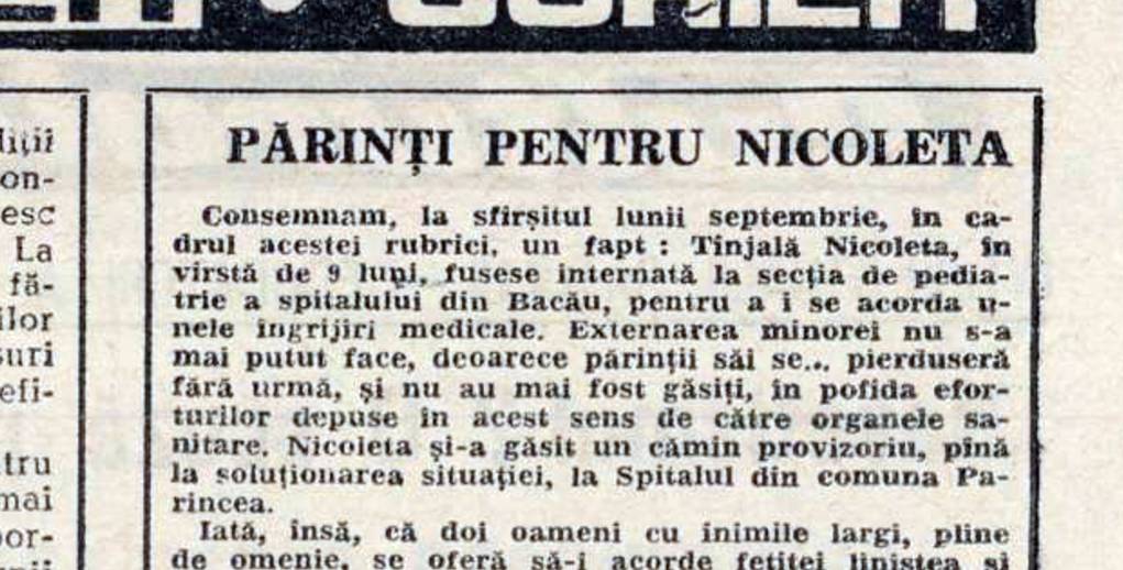 În urmă cu jumătate de secol, în luna noiembrie, ziarul Steagul Roșu din Bacău publica un articol emoționant despre o fetiță pe nume Nicoleta, în vârstă de doar 9 luni, care își pierduse părinții – nu printr-o tragedie clasică, ci printr-o dispariție inexplicabilă. Internată inițial la secția de pediatrie a spitalului din Bacău pentru îngrijiri medicale, micuța Nicoleta a rămas fără familie, în ciuda eforturilor autorităților de a-i găsi părinții.