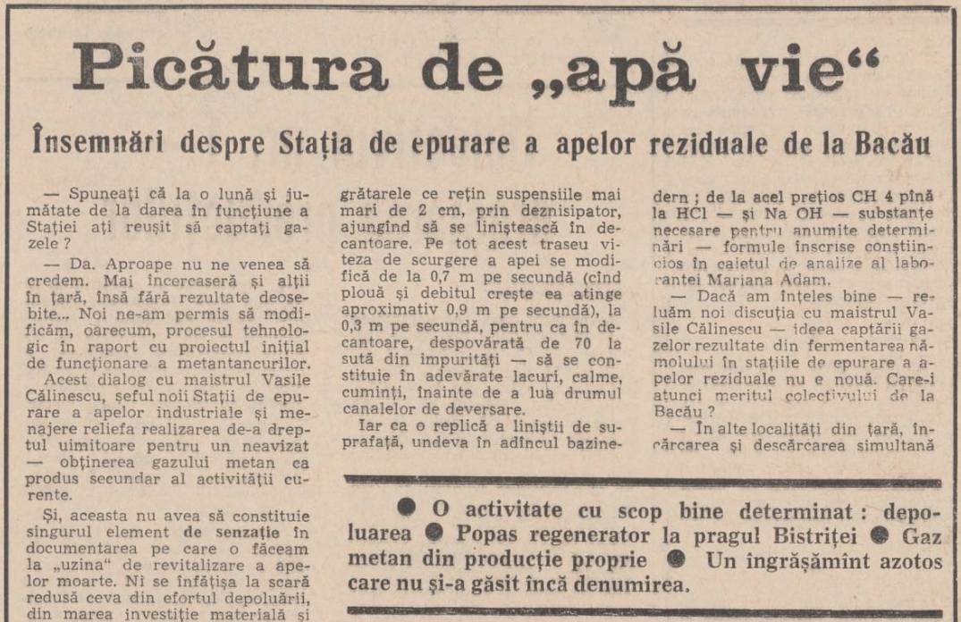 Pe 21 ianuarie 1973, ziarul Steagul Roșu din Bacău publica un articol remarcabil despre realizările Stației de epurare a apelor reziduale din oraș, o investiție inovatoare care avea un impact semnificativ asupra mediului înconjurător și asupra economiei locale. Articolul dezvăluia un proces tehnologic avansat de depoluare a apelor industriale și menajere, subliniind atât progresul realizat, cât și provocările cu care se confrunta personalul din cadrul stației.