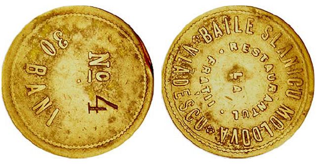 „Prin amabilitatea unui pasionat numismat si colectionar român, dl. Erwin Schäffer, stabilit în Germania de foarte multi ani si detinatorul uneia dintre cele mai importante colectii de jetoane românesti – a precizat Dorel Balaita -, va putem prezenta imaginea acestei «monede locale» a Slanicului, care credem ca a fost pusa în circulatie undeva pe la sfârsitul secolului al XIX-lea si începutul secolului XX”. Jetonul are pe avers inscriptia în cerc perlat exterior, circular, BAILE SLANICU MOLDOVA RESTAURANTUL LA FRATII VLADESCU. Pe revers apare o inscriptie tot în interiorul unui cerc perlat exterior: în partea de sus – No (prescurtare de la cuvântul „numarul”) 4 (inclus), iar în partea de jos valoarea nominala 30 BANI.