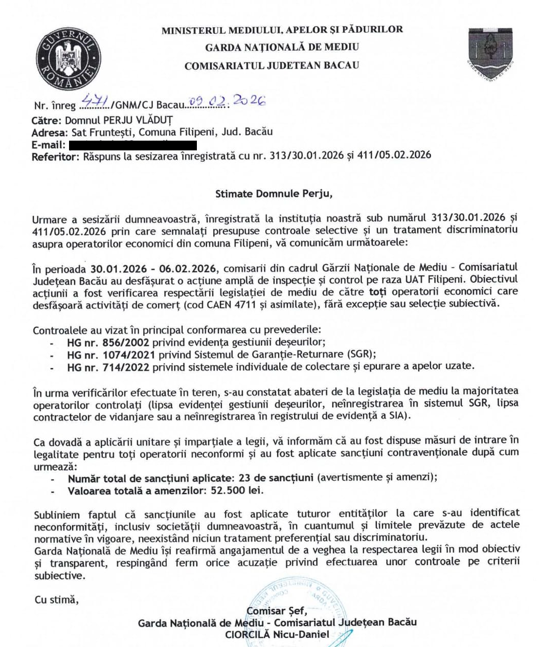 Potrivit punctului de vedere transmis oficial de Garda Națională de Mediu – Comisariatul Județean Bacău, controlul desfășurat în perioada 30.01.2026 – 06.02.2026 pe raza UAT Filipeni a vizat toți operatorii economici care desfășoară activități de comerț (cod CAEN 4711 și asimilate), fără excepții sau selecții subiective. Reprezentanții instituției precizează că verificările au urmărit respectarea legislației privind evidența gestiunii deșeurilor, Sistemul de Garanție-Returnare (SGR) și alte obligații legale în domeniul protecției mediului, iar în urma controalelor au fost constatate abateri la mai mulți agenți economici. În total, au fost aplicate 23 de sancțiuni (avertismente și amenzi), în valoare cumulată de 52.500 de lei. Garda de Mediu subliniază că măsurile au fost dispuse unitar și imparțial, în limitele prevăzute de lege, respingând acuzațiile privind existența unui tratament discriminatoriu.