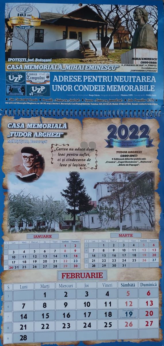 Acesta este titlul sub care a fost editat Calendarul Uniunii Ziariștilor Profesioniști din România (UZPR) pentru anul 2022. În cele 12 pagini ale calendarului apar, firesc, imagini ale caselor memoriale ale tot atâția ziariști, scriitori, publiciști, oameni politici și istorici celebri de la noi, dar întreg conținutul lucrării stă sub semnul operei și renumelui inegalabilului ziarist și poet Mihai Eminescu. De aceea, casa memorială de la Ipotești apare chiar pe coperta calendarului, iar în imagine este surprins și bustul poetului din curtea casei.