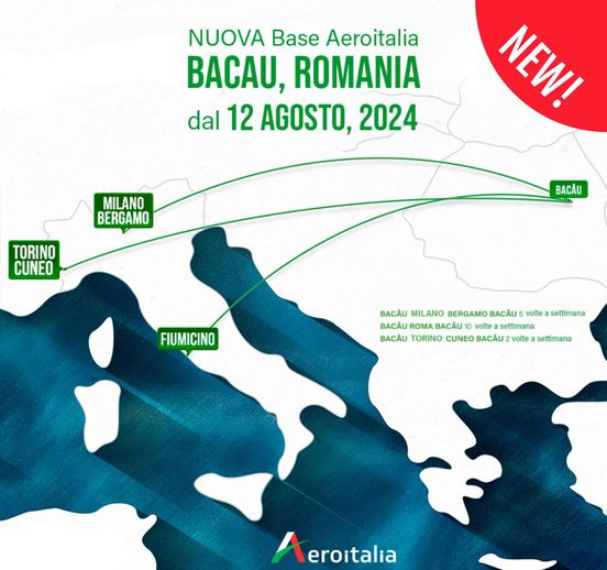 Bacău, România — Aeroitalia a anunțat deschiderea unei baze operaționale pe Aeroportul „George Enescu” din Bacău, marcând prima bază a companiei aeriene în afara Italiei. Baza va fi inaugurată oficial pe 12 august 2024.