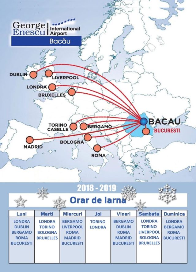 Astfel, lunea, miercurea și vinerea se zboară la/de la Otopeni seara. Duminica, plecarea este dimineața spre București, iar întoarcerea către Bacău este efectuată seara. S-a păstrat numărul destinațiilor externe: Dublin, Liverpool, Londra, Bruxelles, Torino, Bergamo, Bologna, Roma și Madrid.