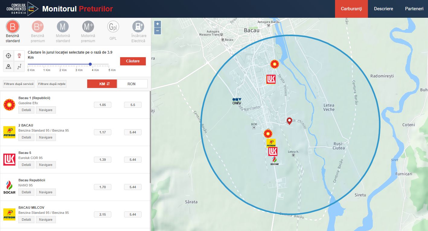 Consiliul Concurenţei a lansat platforma „Monitorul Preţurilor pentru Carburanţi”, care indică prețurile la carburanți de la stațiile situate la maxim 5 kilometri de persoana care inițiază căutarea.