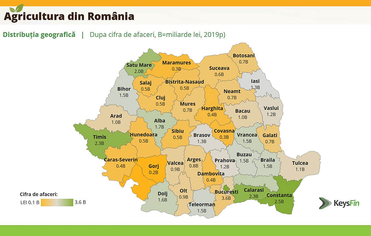 Potrivit analizei KeysFin în topul județelor cu cea mai mare cifră de afaceri din domeniul agriculturii, pe primul loc se situează București, cu 3,6 miliarde lei și 8% din total, Capitala fiind urmată de Constanța (5,4%), de Timiș (5,1%), Călărași (5,1%) și Satu Mare (4,4%).