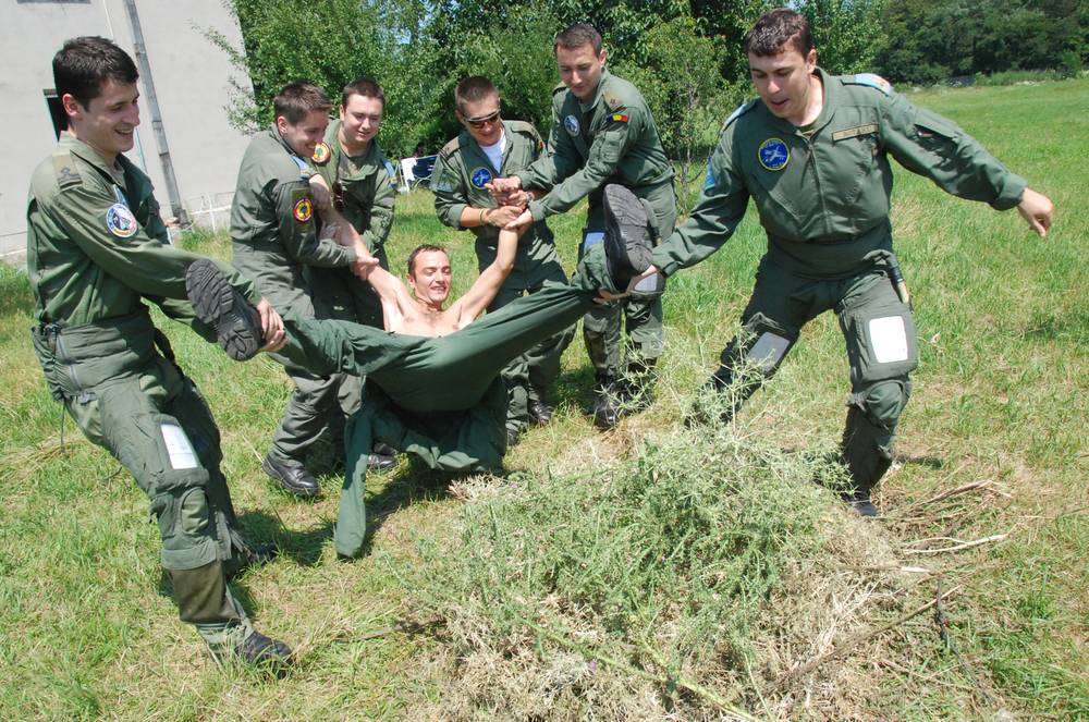 Și aici există o tradiție respectată și pusă în aplicare de generații. Vorbim de botezul pilotului care zboară pentru prima dată singur, la manșă. Întotdeauna instructorul are mai mari emoții decât elevul, așteptând și privind de la sol. Așa este și normal. Acțiunea se desfășoară în 3 etape.