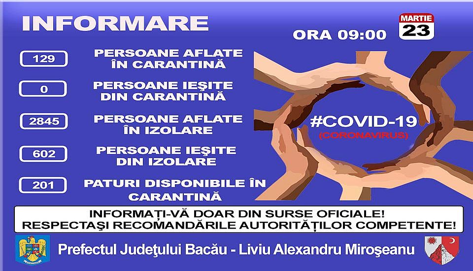 În total, 2.845 de băcăuani au intrat în autoziolare, cu 321 mai multe față de ziua precedentă, majoritatea provenind, cel mai probabil, din rândul celor care au intrat în țară, din alte state unde a fost semnalată prezența Covid – 19.