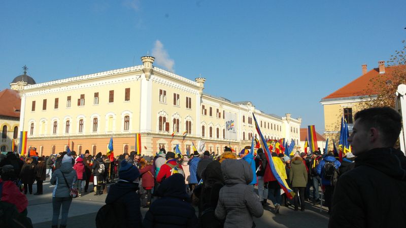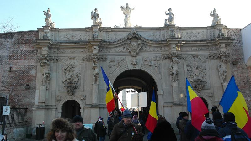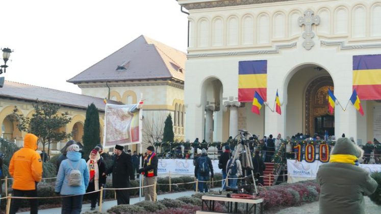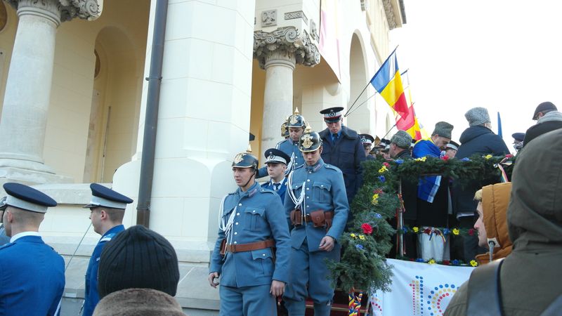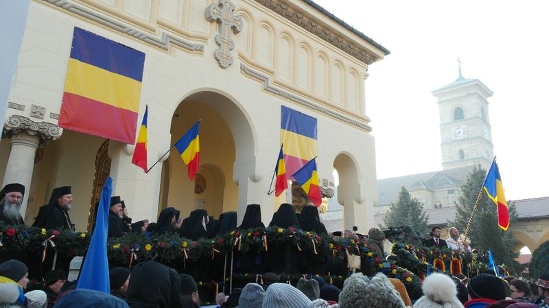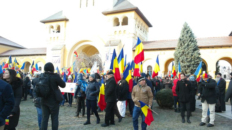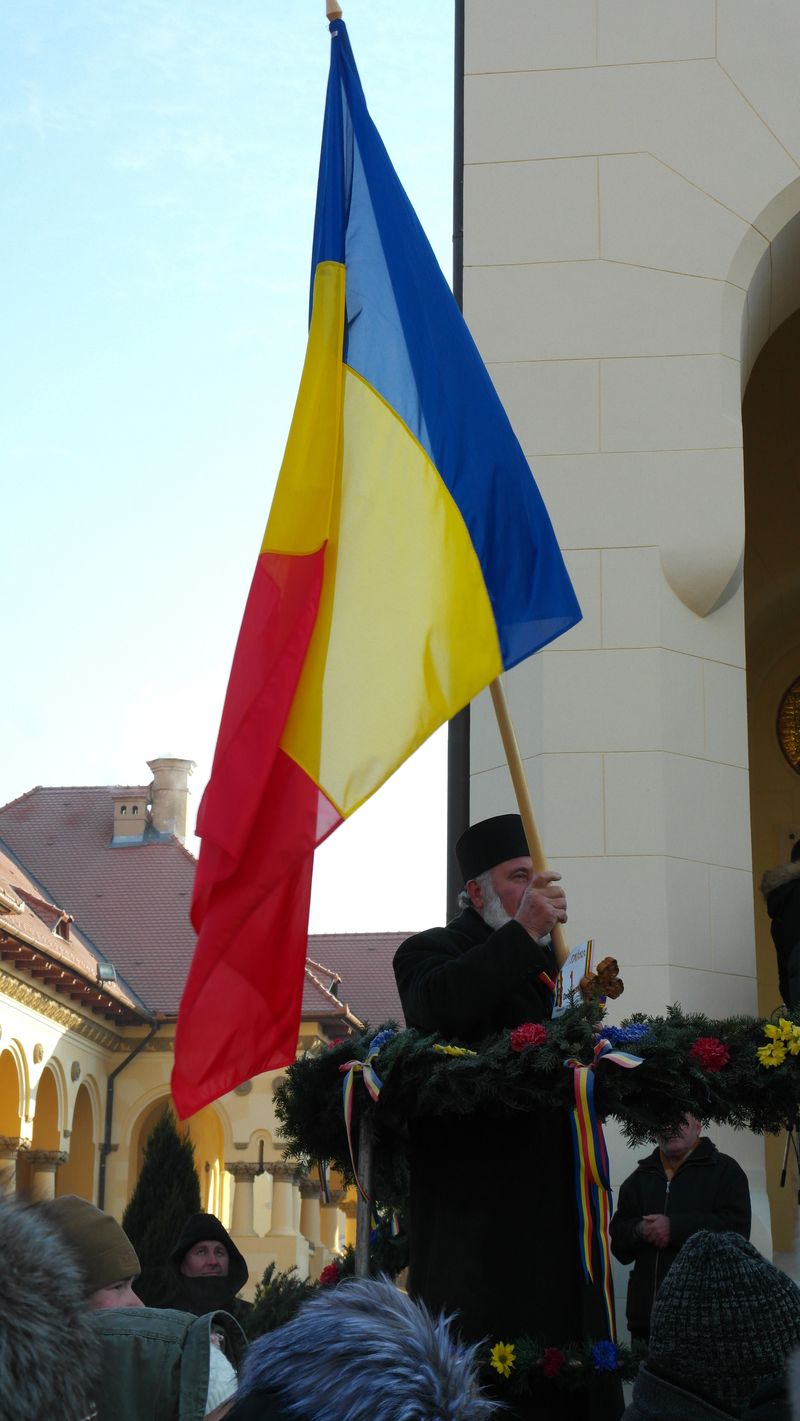 Când am intrat, la ora 7.00, Catedrala era deja neîncăpătoare. Două coruri, unul de preoți și unul al jandarmilor, acompaniau slujba. De la ora 10.00 a urmat un Te Deum, în curtea Arhiepiscopiei care a devenit și ea neîncăpătoare. Oameni cu drapele tricolore, îmbrăcați în costume populare, cu pancarte cu numele localităților din care proveneau împânziseră locul. Și era un ger cumplit: minus 11 grade, în ciuda soarelui cu dinți care te păcălea.