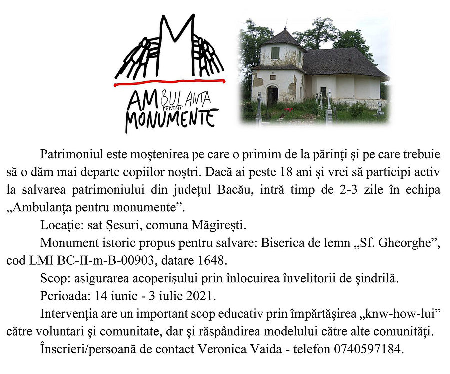 Reabilitarea acoperișului de șindrilă al Bisericii multiseculare „Sf. Gheorghe” din satul Șesuri (comuna Măgirești) este cel mai nou proiect propus de echipa „Ambulanța pentru monumente” al Asociației Monumentum. Cu acest proiect, Ambulanța pentru Monumente va fi pentru prima oară și în județul Bacău.