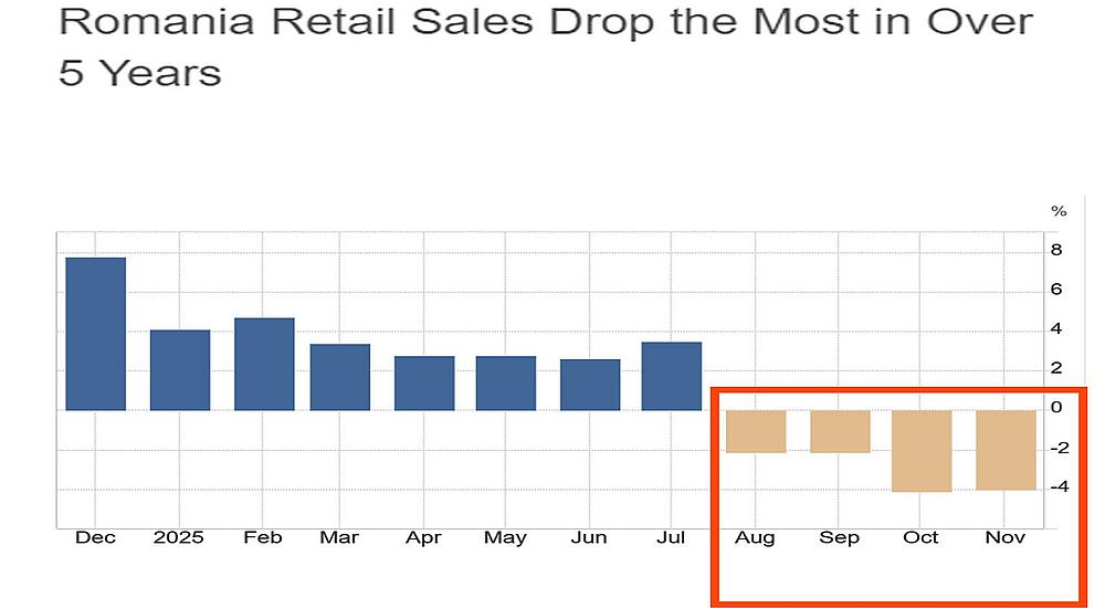 Analistul economic Radu Georgescu atrage atenția asupra unei evoluții îngrijorătoare a consumului populației din România, în contextul datelor publicate recent pentru luna noiembrie. Potrivit acestuia, începând cu luna august 2025, consumul populației ar fi înregistrat o scădere accelerată, un fenomen rar întâlnit în economia românească.
