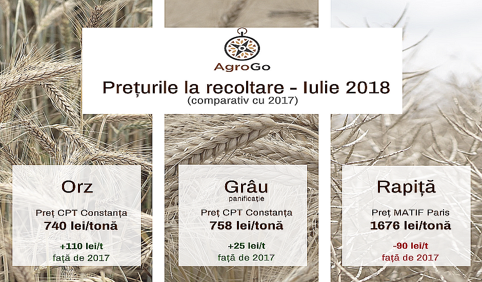 Grâul (de panificație): Dacă la produsele amintite mai sus am avut parte de o creștere semnificativă a prețului (orz), respectiv o scădere (cazul rapiței), la grâu diferența prețului față de aceeași perioadă din anul trecut nu e așa de mare. Prețul oferit de anumiți traderi din Constanța ajunge acum la 758 lei/tonă (livrat la Constanța), cu 25 de lei mai mult față de aceeași perioadă a anului trecut. Prețul grâului la marile burse (MATIF Paris sau CME Chicago) este pe un ușor trend ascendent, pe baza ultimelor informații oferite în raportul USDA pe luna Iulie, care prognozează producție, exporturi și stocuri în ușoară scădere pentru viitorul sezon (2018/2019) la grâu.