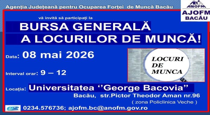 O bursă a locurilor de muncă dedicată persoanelor aflate în căutarea unui serviciu va avea loc pe 8 mai, la Bacău. Evenimentul este organizat cu sprijinul Agenția Județeană pentru Ocuparea Forței de Muncă Bacău și își propune să faciliteze întâlnirea directă între angajatori și potențialii angajați.