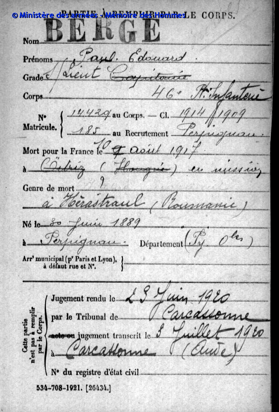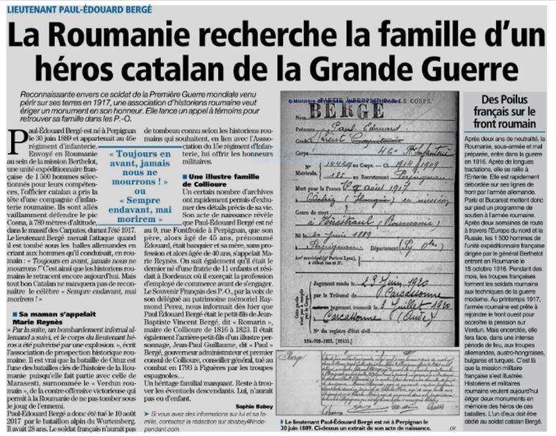 Informații despre acest erou au fost trimise Asociației Prospectorii Istoriei de generalul Gilles Glin, reprezentantul Souvenir Français din sudul Franței. Inițiatorii proiectului au primit, astfel, lucrarea despre Paul Edouard Bergé a lui Raymond Perez, memorialist pentru Pirineii de Est.