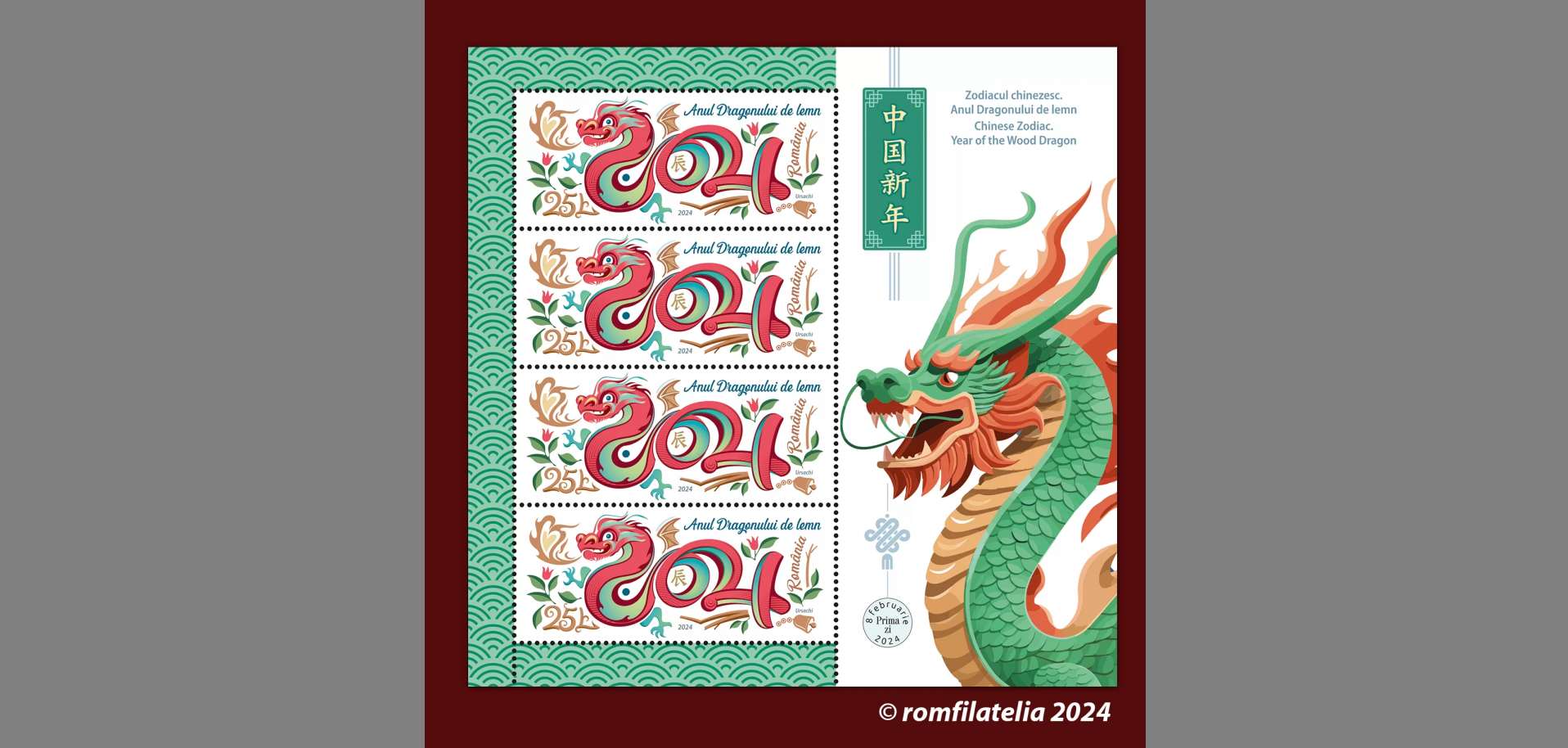 Romfilatelia introduce în circulație, pe 8 februarie, inclusiv prin magazinul său din Bacău, o emisiune filatelică tradițională, Zodiacul chinezesc. Anul Dragonului de lemn, compusă dintr-o marcă poștală cu valoarea de 25 de lei și un plic „prima zi”.
