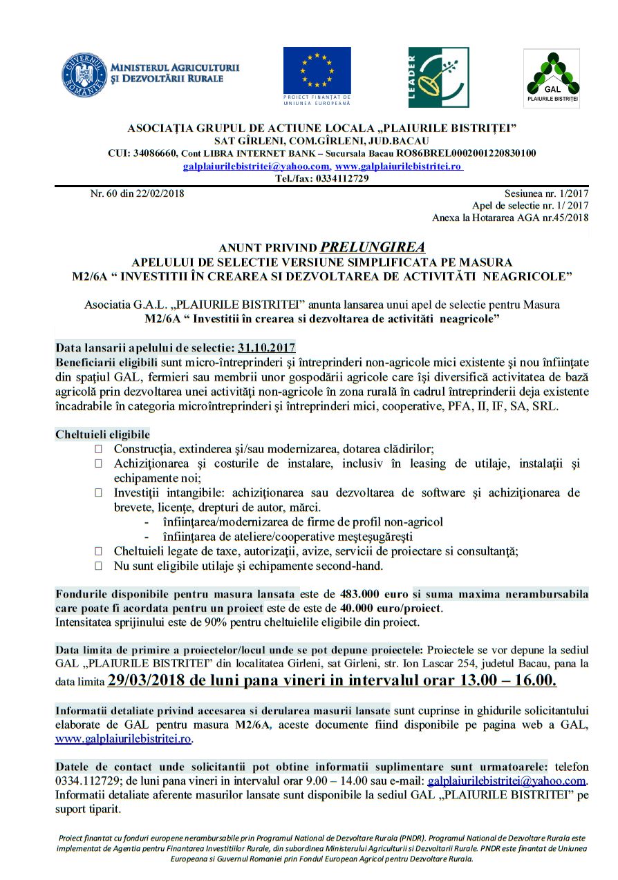 ANUNT PRIVIND PRELUNGIREA APELULUI DE SELECTIE VERSIUNE SIMPLIFICATA PE MASURA M2/6A “ INVESTITII ÎN CREAREA SI DEZVOLTAREA DE ACTIVITĂTI NEAGRICOLE”