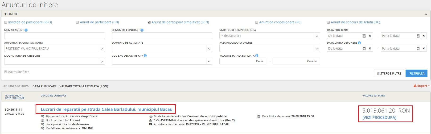 Anunțul pentru licitația organizată de Primăria Bacău cu scopul de a asfalta Calea Bârladului a fost publicat, marți, în Sistemul Electronic de Achiziții Publice (SEAP).