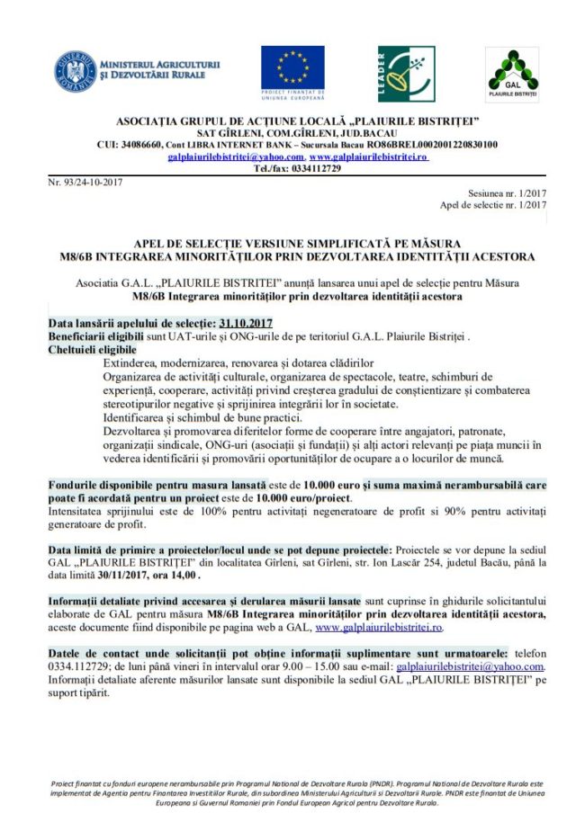 Comunicat de presăAPEL DE SELECȚIE VERSIUNE SIMPLIFICATĂ PE MĂSURA M8/6B INTEGRAREA MINORITĂȚILOR PRIN DEZVOLTAREA IDENTITĂȚII ACESTORAde Deșteptarea - 19 februarie 2018AcțiuneFacebookTwitterWhatsAppTelegramVK
