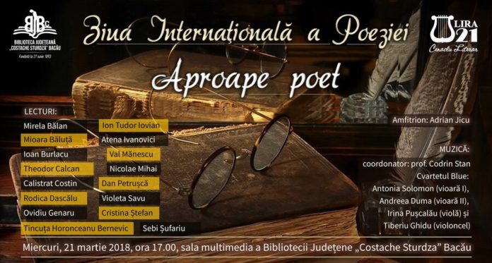 Cu ocazia Zilei Internaționale a Poeziei, miercuri, 21 martie, ora 17.00, la Biblioteca Judeţeană „Costache Sturdza” va avea lor întâlnirea cu poezia şi muzica, sub genericul „Aproape de Poet”.