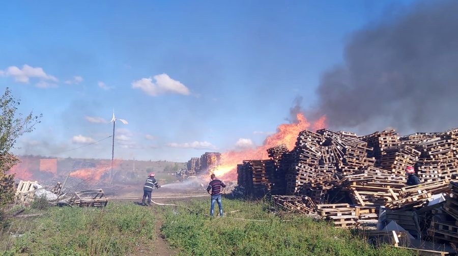 La un depozit de boxpaleti din lemn depozitați în aer liber, în satul Urechești, a izbucnit un incendiu.