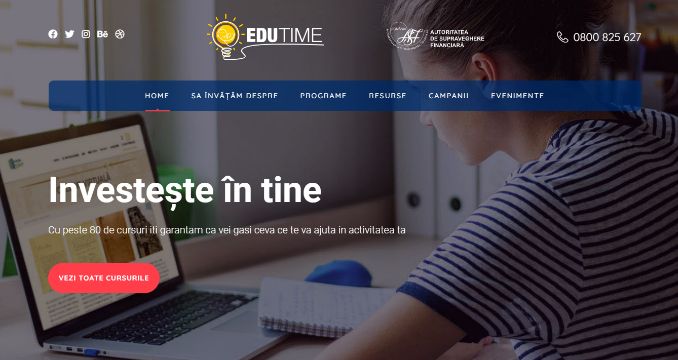 Site-ul are un design modern, este ușor de accesat și poate fi utilizat atât de pe desktop, cât și de pe platformele mobile. Structura www.edutime.ro este una intuitivă, adaptată ultimelor tendințe în materie de nagivare online.