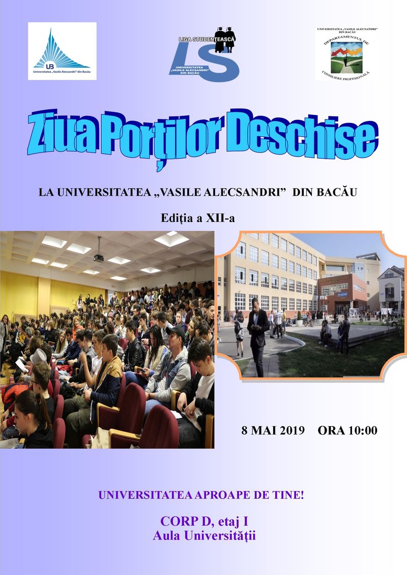 Începând cu ora 10, în Aula Universităţii „Vasile Alecsandri” din Bacău va avea loc Ziua Porţilor Deschise, când sunt aşteptaţi un număr de peste 150 de elevi de la liceele din municipiul Bacău.