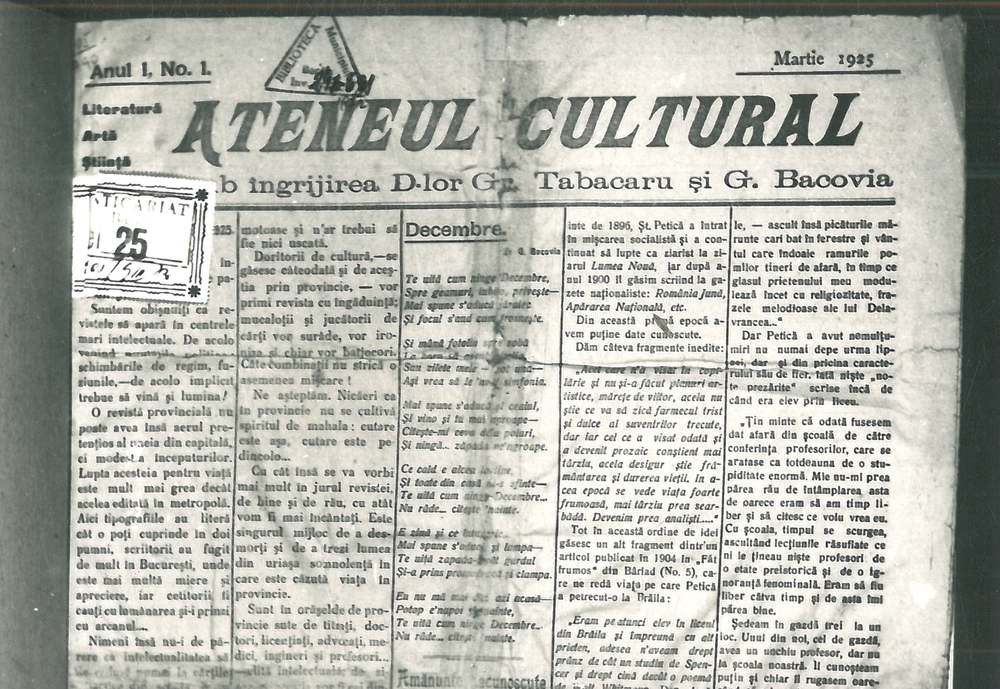 Cu experienţa şi înzestrarea tehnică tecuceană (primele patru numere au fost realizate de Tipografia Cultura), Grigore Tabacaru, însoţit de George Bacovia, a făcut să apară în martie 1925 „Ateneul cultural”, revistă devenită polul coagulant al scriitorilor din această regiune a ţării. Pedagogul şi publicistul Tabacaru a expus în articolul-program argumente de bun-simţ (nu e înţelept ca „intelectualitatea să fie redusă la cărțile didactice din școală și la șezătorile de duminică”), dar şi temerile („jucătorii de cărți vor surîde, vor ironiza și chiar vor batjocori. Ne așteptăm. Nicăieri ca în provincie nu se cultivă spiritul de mahala: cutare este așa, cutare este pe dincolo…”). E şi un câştig aici: „Cu cît se va vorbi mai mult în jurul revistei, de bine și de rău, cu atît vom fi mai încîntați”, pentru că, sociologic vorbind, „este singurul mijloc de a dezmorți și de a trezi lumea din uriașa somnolență în care este căzută viața în provincie”. Un prim bilanţ, din 1927, este realist: „Totuşi în acest colţ de provincie, unde cărţile se joacă, iar nu se citesc […], ne facem un merit că am grupat zeci de tineri în jurul acestei reviste”. În doar patru ani (1925-1928), s-a ajuns la o bună vizibilitate naţională. Durata poate fi extinsă dacă luăm în seamă suplimentele de sub genericul „Publicaţiile Ateneului cultural din Bacău”: „Bacăul de altădată” (nr. 1-4/1930), „Vechiul Bacău” (nr. 5/1930), „Bisericile Bacăului” (nr. 6-7/1932).