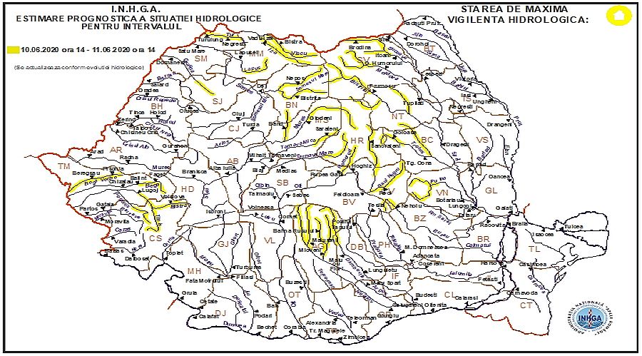 Institutul Național de Hidrologie și Gospodărire a Apelor a emis o atenționare hidrologică cod galben pentru intervalul 10 iunie, ora 14,00 – 11 iunie, ora 14,00. Aceasta vizează posibilitatea producerii de scurgeri importante pe versanți, torenți și pâraie, viituri rapide pe râurile mici, cu posibile efecte de inundații locale și creșteri de debite și niveluri, cu posibile depășiri ale cotelor de atenție.