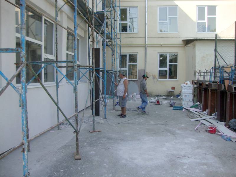 Dupa aceste operatiuni demarate la mijlocul lunii august, practic au inceput si lucrarile. La momentul vizitei noastre erau finalizate lucrarile de la Gradinita 33, structura a scolii, acolo unde s-a facut deja igienizarea spatiilor de bucatarie, magazie, oficiu si grupuri sanitare. Pâna in prezent, in Scoala „C.Platon” s-au reabilitat trei sali de clasa, lucrare a ramas restanta de anul trecut, si s-a izolat termic un perete nordic al cladirii, o lucrare absolut necesara pentru a evita pericolul aparitiei mucegaiului in salile de clasa din acea parte.